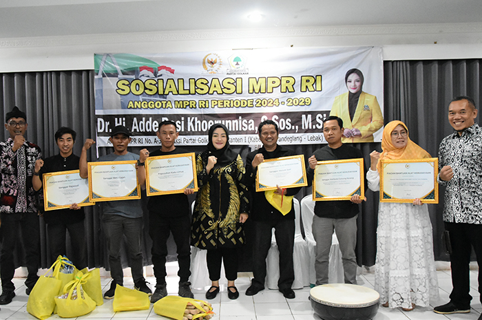 PANDEGLANG, – Anggota Komisi X Dewan Perwakilan Rakyat Republik Indonesia dari Fraksi Partai Golkar, Adde Rosi Khoerunnisa melaksanakan kegiatan sosialisasi Empat Pilar Kebangsaan sekaligus penyerahan bantuan alat kesenian bagi pelaku seni di Aula PKPRI Pandeglang, Kabupaten Pandeglang, pada Jumat, 3 April 2026.