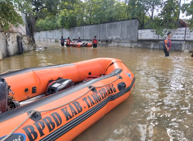 Dalam pantauan lokasi banjir personel BPBD gabungan dari kabupaten Tangerang dan Provinsi Banten dikerahkan untuk mengevakuasi karyawan yang terjebak banjir.