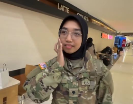 Perempuan berhijab ini sedang viral di media sosial saat akan terbang ke Amerika dengan mengenakan seragam tentara Army National Guard AS.